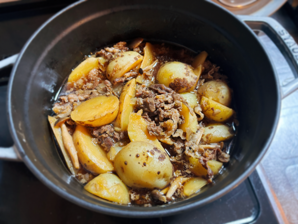 小〜中サイズのじゃがいも8個ぐらいと、牛こま250グラムほど。冷蔵庫にあったしめじ半株ぐらい。