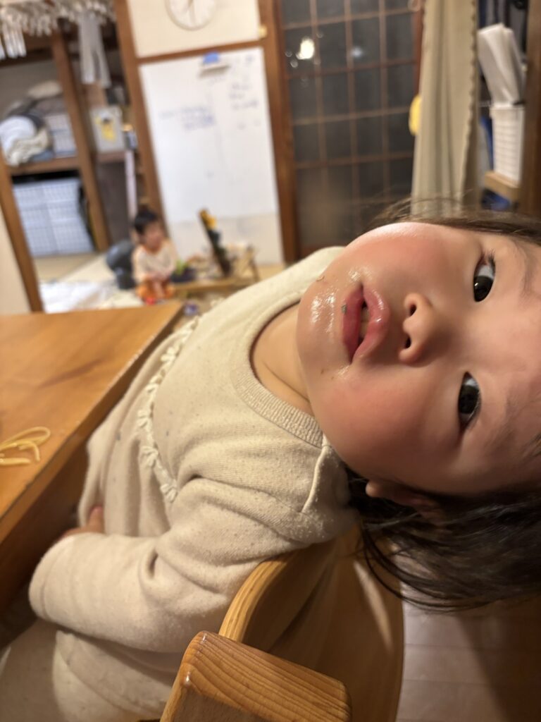 お口がテカテカ。おいしかったね。なぜかカメラを向けると反る娘。