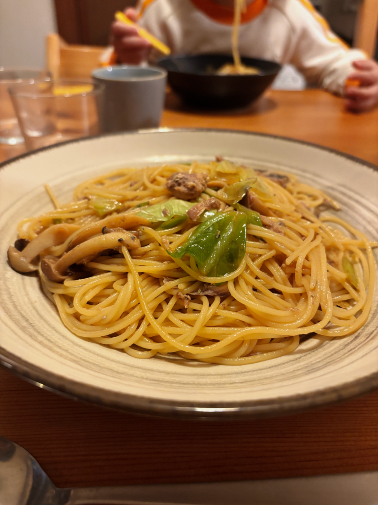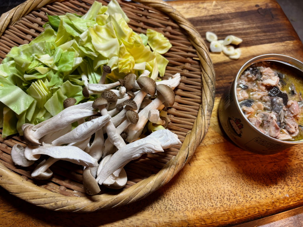 家に帰って冷蔵庫を開くと、半株になったしめじ。野菜室をのぞくと、半分使った残りのキャベツ、保存してあるにんにく。シンク下のストック箱に、推しの鯖缶発見。忘れてた!忘れてたからなお嬉しい!そして細いパスタ麺と目が合う。美味しそうなパスタができそうだなあ。