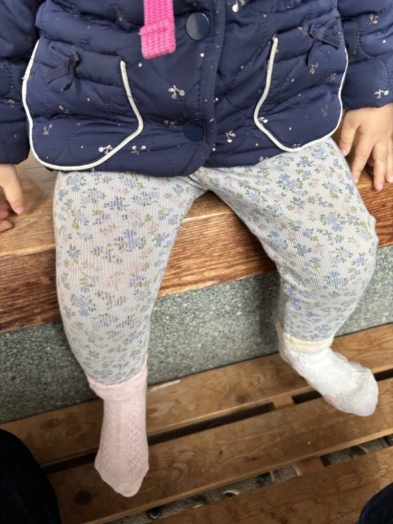 娘が毎日、「アンパンマンのくつしたがいい」というのですが、このことだそうです。それはこの、ズボンをくつ下にインするスタイル。慌てていてうまくインできないと、とてもおこられます。余談ですが、写真の通り「左右違うくつしたをはく」もブームです。